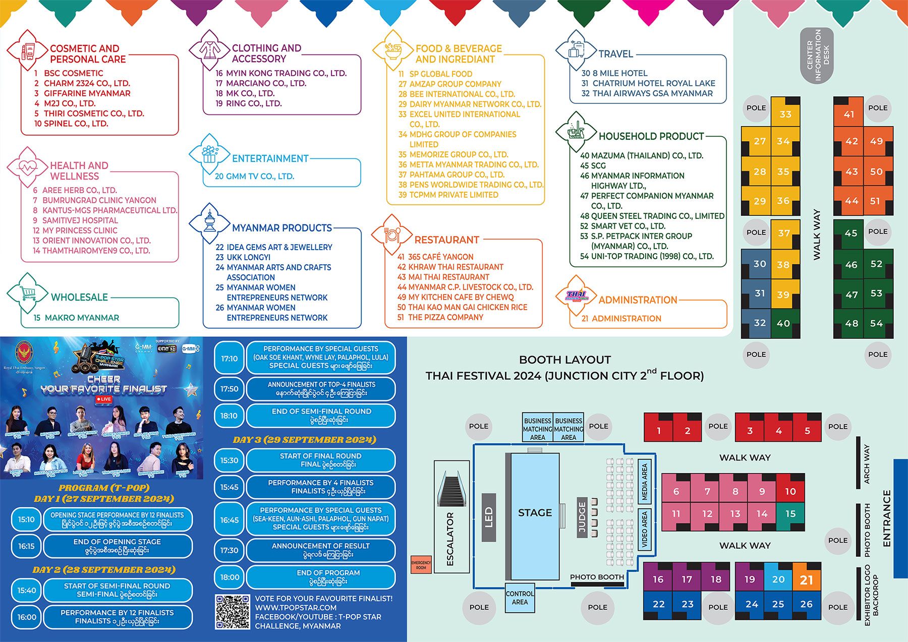 Here is the layout of 54 Thai and Myanmar booths of various catagories of products and services at the "Thai Festival 2024 in Yangon" organized by the Royal Thai Embassy in Yangon, at the 2nd floor of Junction City during 27 - 29 September 2024, 09.30 - 19.00 hrs.