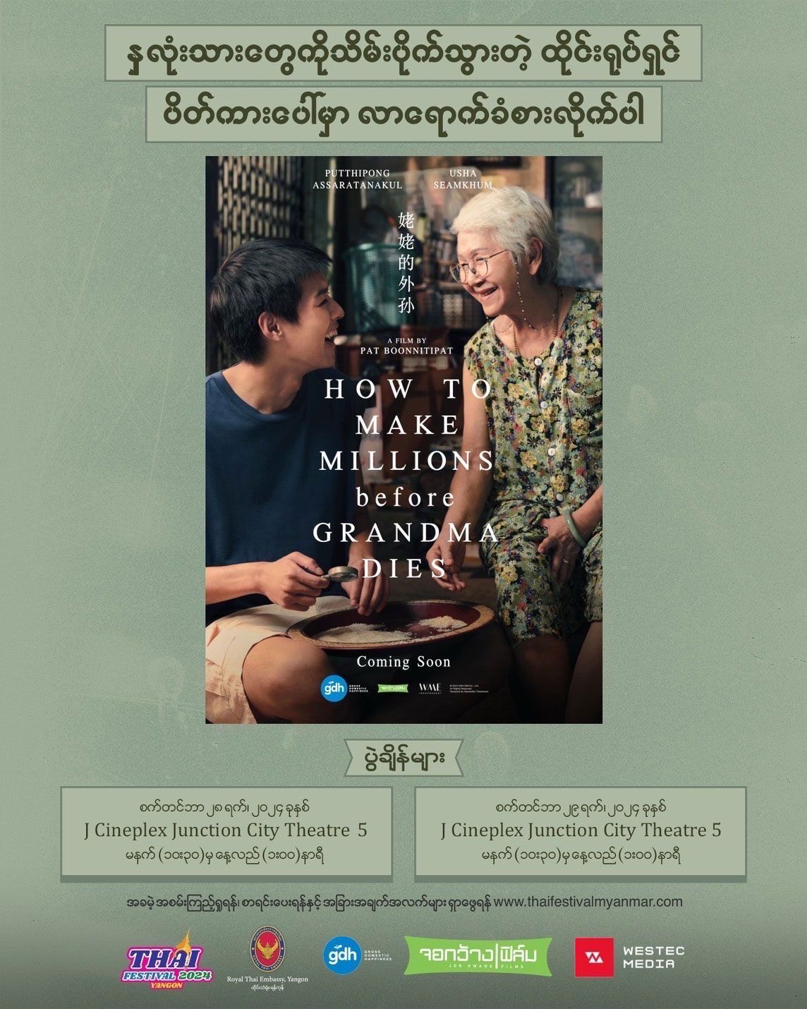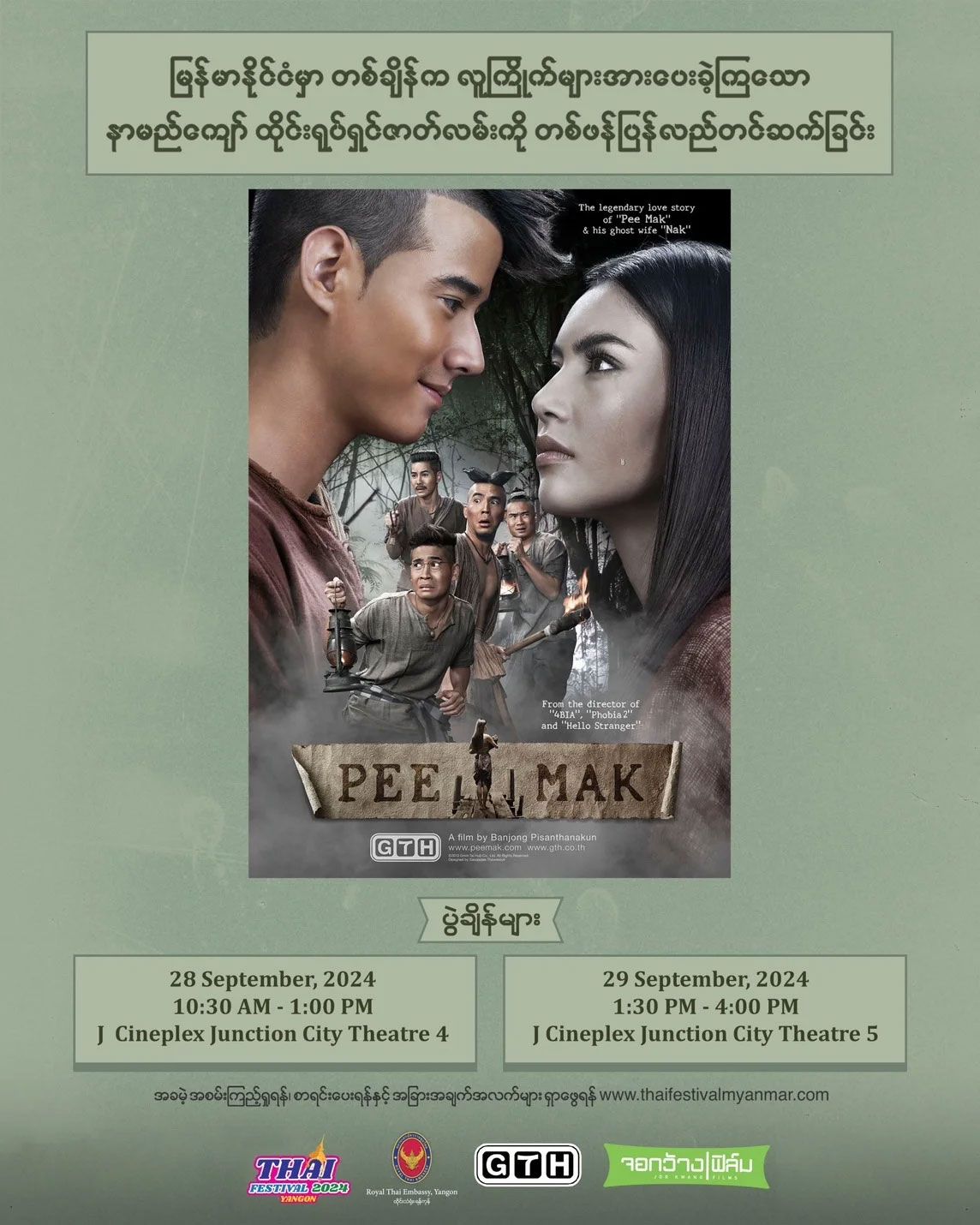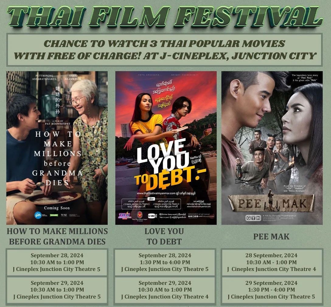 ၂၀၂၄ စက်တင်ဘာလ ၂၇-၂၉ အထိ ထိုင်းသံရုံး ရန်ကုန်ကနေ ဦးစီးကျင်းပတဲ့ "Thai Festival 2024 in Yangon" ပွဲတော်မှာဆိုရင် နာမည်ကြီး ထိုင်းရုပ်ရှင်ကား (၃) ကားကိုလည်း Junction City စင်တာရဲ့ ၅ လွှာမှာရှိတဲ့ J-Cineplex မှာ ထိုင်းရုပ်ရှင်ချစ်သူတွေအတွက် အခမဲ့ပြသပေးသွားမှာဖြစ်ပါတယ်။