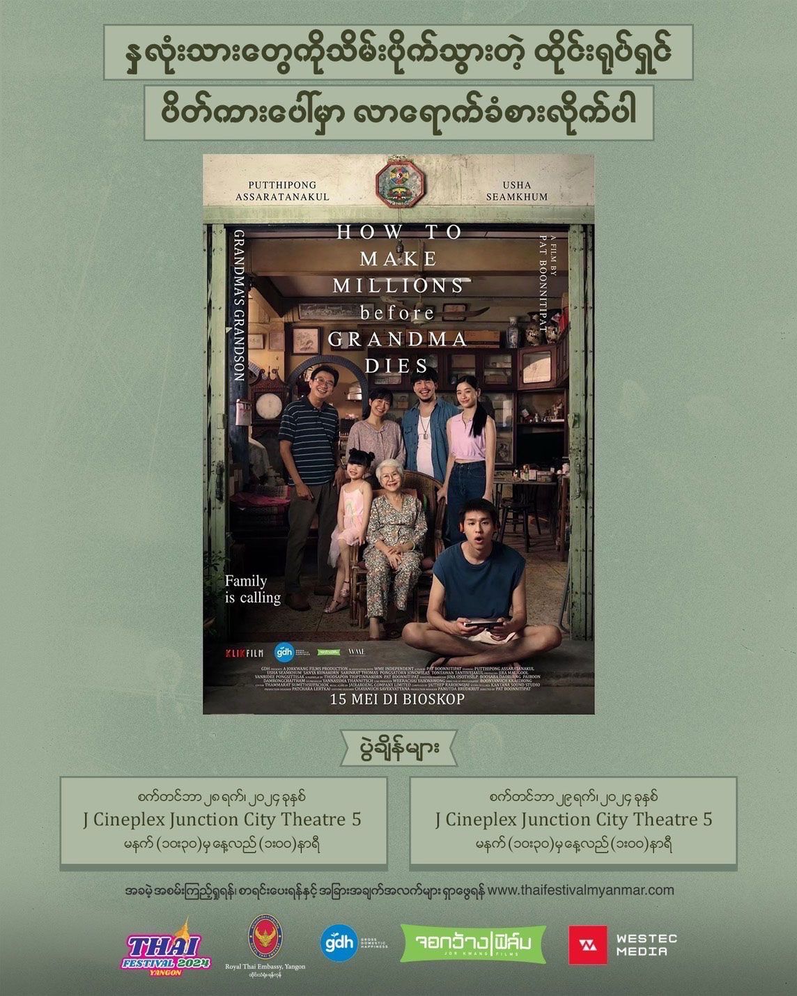 * Famous Thai movie from GDH559 company, starring Billkin Phtthipong and Usha which have made breaking revenue records in many countries including Myanmar. As it is a heartwarming film delving into complexity of family relationships, sacrifices and the pursuit, the Royal Thai Embassy brings it to screen in Yangon again.