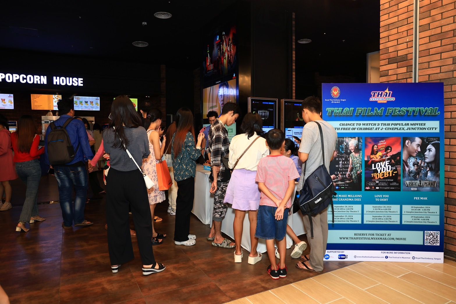 (3) The Thai Film Festival, in which the Royal Thai Embassy collaborated with GDH 559 and GMMTV, screened three Thai films at J Cineplex, located on the 5th floor of Junction City Shopping Mall. The featured films included “How to Make Millions Before Grandma Dies” and “Pee Mak”, which were re-screened due to their immense popularity in Myanmar. In addition, “Love You to Debt” was shown for the first time in Myanmar. The screening of the movies was free of charge for those who are interested. The event garnered significant attention from the Myanmar public, with all six movie screening sessions, totalling over 1,804 seats, being fully reserved.
