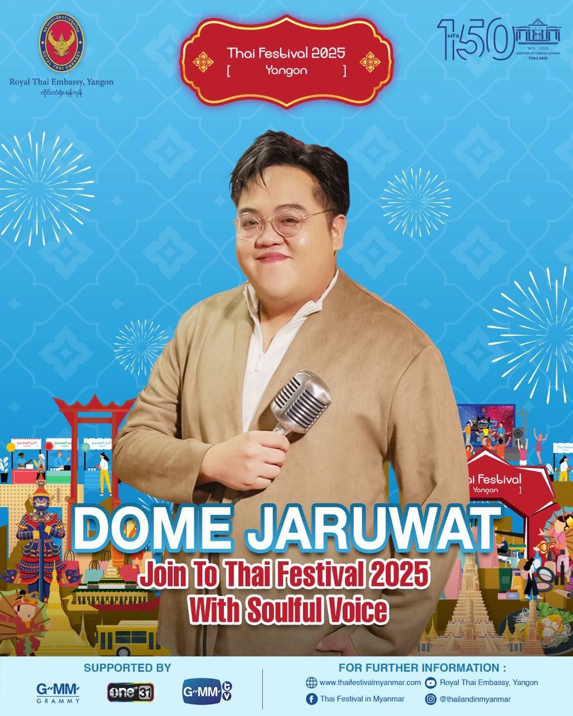 🗓️ If you would like to meet and greet Dome Jaruwat at the event stage of "Thai Festival 2025 in Yangon", do not forget to make the reservation to get entry ticket to enter to the event stage on Sunday 1 June 2025, 10.00 hrs and 10.30 hrs (Myanmar time) at www.thaifestivalmyanmar.com/ticket .